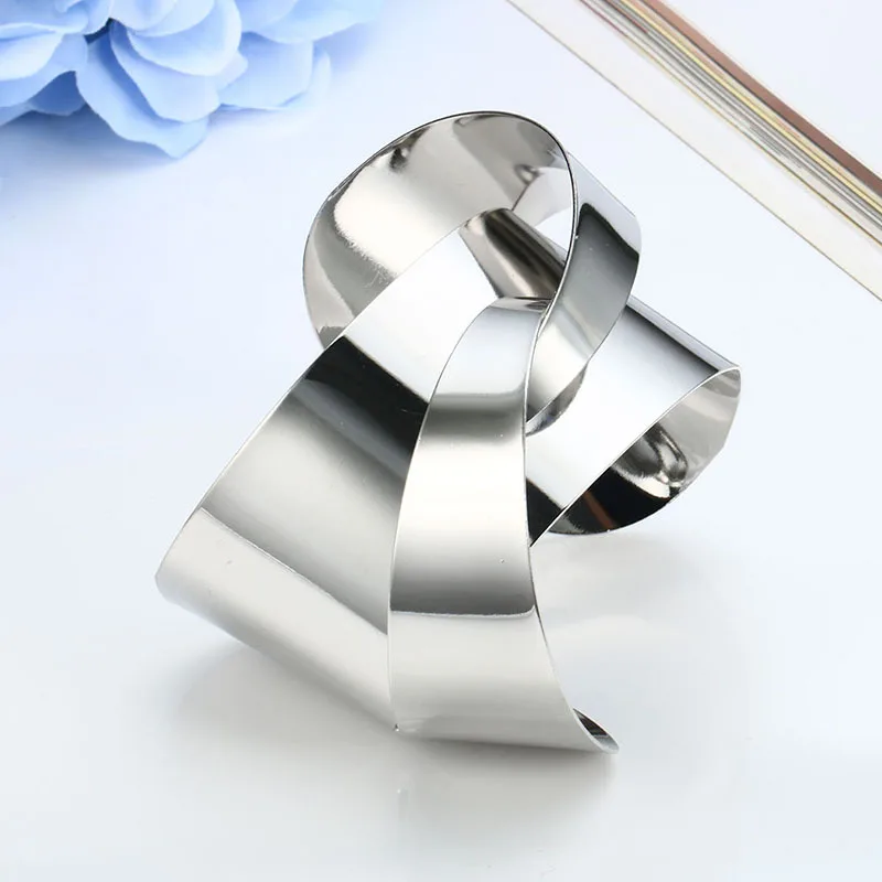 en la imagen la hay en dos colores, yo la elegí en color plata puesto que me parece menos urraca que el dorado. Como podéis ver es un brazalete rígido color plateado y con un entrelazado muy bonito, no pesa nada
